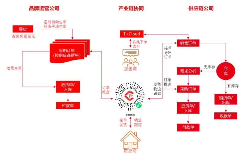 為了滿足餐飲門店要貨頻率高、時(shí)效性要求高的需求,遇江南在用友暢捷通T+Cloud的幫助下,應(yīng)用【智能供應(yīng)鏈】打通了“門店-供應(yīng)鏈公司-供應(yīng)商”三者之間的信息鏈路。