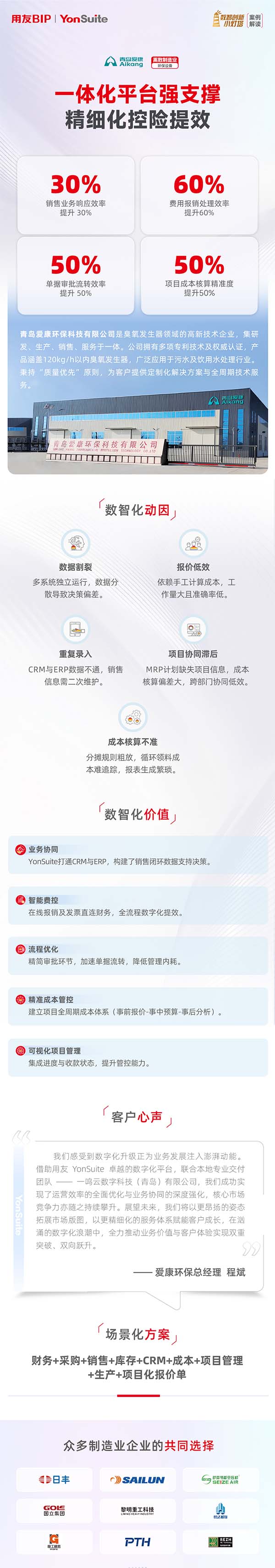 “臭氧發(fā)生器的核心是‘精準(zhǔn)’—— 精準(zhǔn)的臭氧濃度、精準(zhǔn)的反應(yīng)時(shí)間,才能保證水質(zhì)安全。企業(yè)管理也是如此,只有精準(zhǔn)的成本管控、高效的協(xié)同效率,才能支撐企業(yè)持續(xù)發(fā)展。” 愛(ài)康環(huán)??偨?jīng)理程斌在談及轉(zhuǎn)型時(shí)感慨道,“YonSuite 為我們注入了‘精準(zhǔn)基因’,讓成本可量化、流程可追蹤、決策有依據(jù)。未來(lái),我們將以更精細(xì)化的管理和更可靠的產(chǎn)品,讓每一臺(tái)臭氧發(fā)生器都成為客戶(hù)信賴(lài)的‘水質(zhì)衛(wèi)士’。”