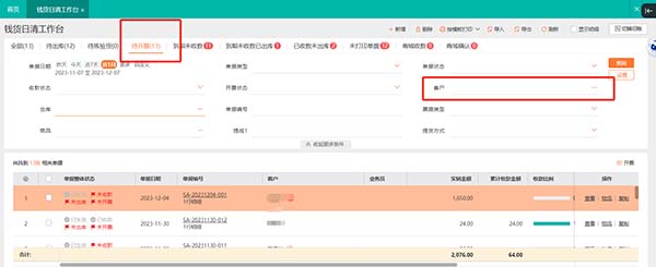 1、點(diǎn)擊【銷售管理】-【錢貨日清工作臺(tái)】-【待開票】,在表頭篩選下要開票的客戶名稱。