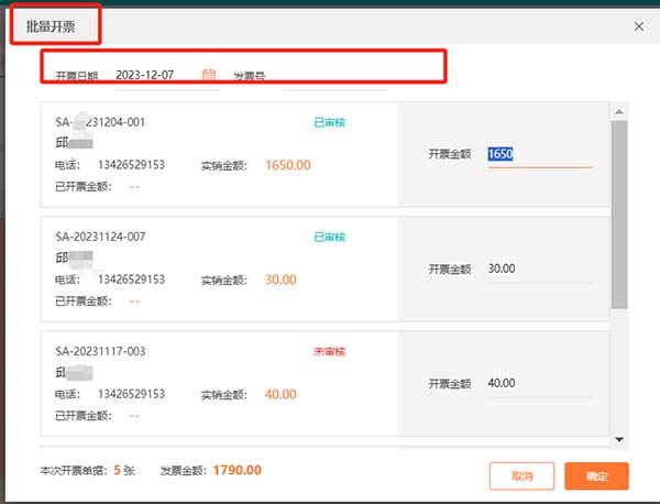2.勾選要進(jìn)行開票的單據(jù),點(diǎn)擊表體右上角的【開票】,輸入發(fā)票號、開票日期等數(shù)據(jù),即可對多張單據(jù)進(jìn)行開票處理。