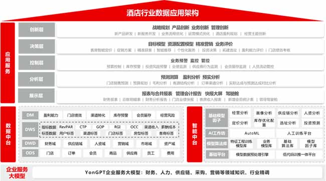 以YonGPT企業(yè)大模型為支撐,通過用友iuap數(shù)據(jù)中臺對酒店企業(yè)的人、財、經(jīng)營、營銷、資產(chǎn)、供應(yīng)鏈等多元業(yè)務(wù)數(shù)據(jù)進行匯聚和治理,并圍繞核心業(yè)務(wù)線的經(jīng)營、管理、會員、運營等重要指標構(gòu)建分析體系,利用智能中臺的模型算法庫訓(xùn)練、構(gòu)建的酒店行業(yè)模型因子,為酒店企業(yè)提供5層全面數(shù)據(jù)服務(wù),深入洞察企業(yè)運營、識別潛在的業(yè)務(wù)風(fēng)險和機會,并提供智能化的解決方案,從而提高經(jīng)營決策水平和業(yè)務(wù)運營效率。