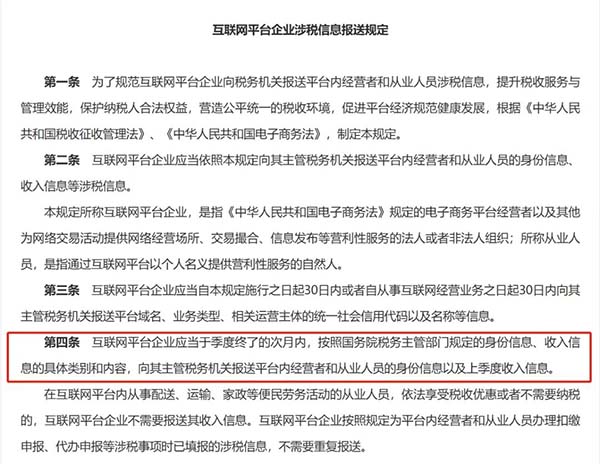 近日,《互聯(lián)網(wǎng)平臺(tái)企業(yè)涉稅信息報(bào)送規(guī)定》正式出臺(tái)實(shí)施,一石激起千層浪,社會(huì)各界對(duì)此廣泛關(guān)注。那么,這項(xiàng)新規(guī)究竟藏著哪些變化?又將對(duì)哪些群體產(chǎn)生深遠(yuǎn)影響?