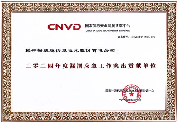憑借成熟的安全管理體系和規(guī)范化的安全運(yùn)營(yíng)能力,用友暢捷通榮獲“CNVD漏洞處置突出貢獻(xiàn)單位” 與 “CNVD漏洞應(yīng)急工作突出貢獻(xiàn)單位” 兩項(xiàng)國(guó)家級(jí)榮譽(yù)。這不僅是對(duì)暢捷通在網(wǎng)絡(luò)安全領(lǐng)域?qū)I(yè)能力的權(quán)威認(rèn)可,也體現(xiàn)了在保障客戶數(shù)據(jù)安全、筑牢數(shù)智防線方面的持續(xù)投入與扎實(shí)成果。