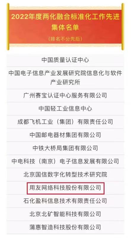 據(jù)悉,為切實(shí)貫徹中共中央、國(guó)務(wù)院《國(guó)家標(biāo)準(zhǔn)化發(fā)展綱要》,全面落實(shí)《“十四五”信息化和工業(yè)化深度融合發(fā)展規(guī)劃》的工作部署,充分調(diào)動(dòng)社會(huì)各界協(xié)同推進(jìn)兩化融合標(biāo)準(zhǔn)化工作的積極性和創(chuàng)造性,推動(dòng)兩化融合標(biāo)準(zhǔn)高質(zhì)量發(fā)展,全國(guó)兩化融合標(biāo)委會(huì)(TC573)經(jīng)自主申報(bào)、材料審查和綜合評(píng)審,授予用友網(wǎng)絡(luò)科技股份有限公司等13家單位為“2022年度兩化融合標(biāo)準(zhǔn)化工作先進(jìn)集體”,表彰先進(jìn),引領(lǐng)發(fā)展。