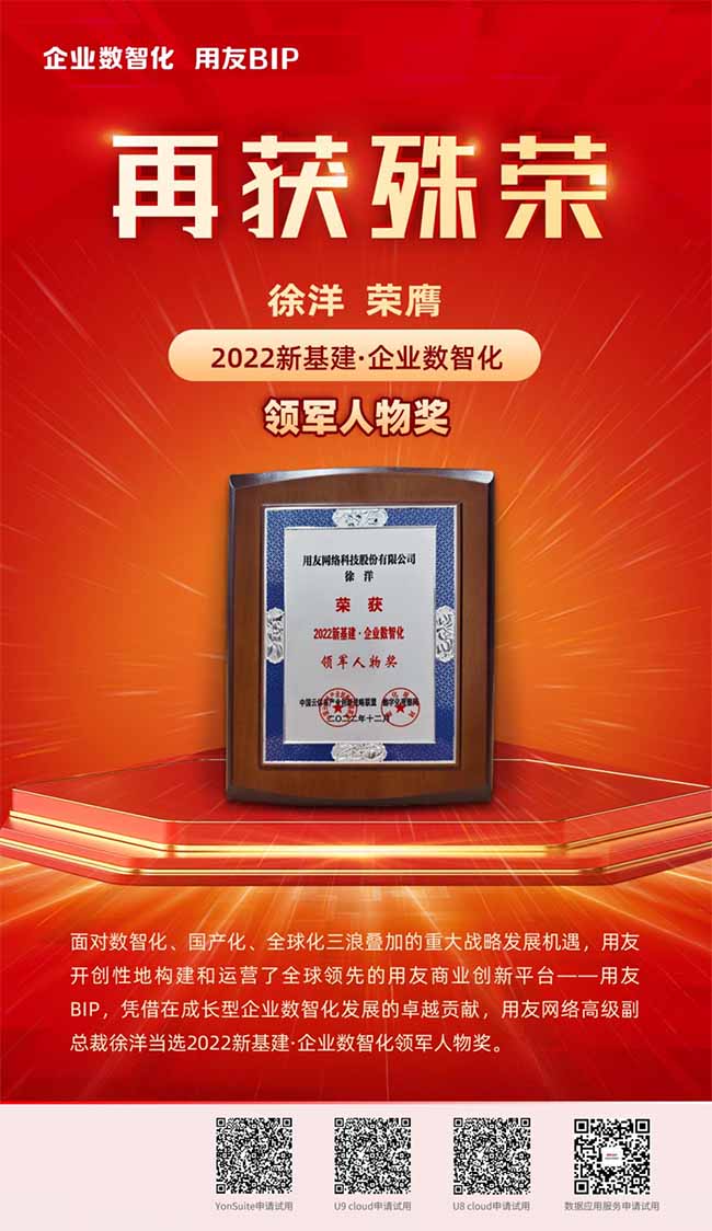 今年1月,國務(wù)院印發(fā)的《“十四五”數(shù)字經(jīng)濟(jì)發(fā)展規(guī)劃》明確提出,到2025年,數(shù)字經(jīng)濟(jì)核心產(chǎn)業(yè)增加值占國內(nèi)生產(chǎn)總值比重達(dá)到10%;展望2035年,力爭形成統(tǒng)一公平、競爭有序、成熟完備的數(shù)字經(jīng)濟(jì)現(xiàn)代市場體系,數(shù)字經(jīng)濟(jì)發(fā)展水平位居世界前列。依托國家政策紅利,面對數(shù)智化、國產(chǎn)化、全球化三浪疊加的重大戰(zhàn)略發(fā)展機(jī)遇,用友開創(chuàng)性地構(gòu)建和運(yùn)營了全球領(lǐng)先的用友商業(yè)創(chuàng)新平臺(tái)——用友BIP,憑借在成長型企業(yè)數(shù)智化發(fā)展的卓越貢獻(xiàn),用友網(wǎng)絡(luò)高級副總裁徐洋當(dāng)選2022新基建·企業(yè)數(shù)智化領(lǐng)軍人物獎(jiǎng)。